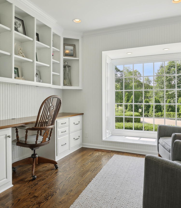 The family room is a beautiful space, generously proportioned and well equipped with stunning wood-burning fireplace, built-in bookshelves.